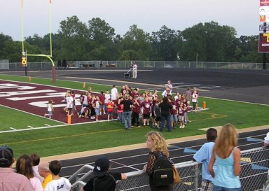 We left the house about 6:40, thinking that 30 minutes was plenty of time to drive 2 miles to the stadium & get into the gates on time. (He was supposed to be there at 7:10.) Turns out, it wasn't early enough. We didn't realize it, but tonight was the first home game of the season & apparently the people of Whitehouse were very excited about that. The traffic was horrible. At 7:10, we were still out in the road trying to get into the stadium gates. It was 7:15 before we got into the parking lot driveway. Larry let the kids & I out at the gates & we took off running to try to get Samuel to his spot. We had to stand in a long line to buy tickets. [NOTE: Larry tried to buy them in advance at the high school today but they had sold out before he got there.] While standing there, a friend of mine who already had her tickets walked up & offered to take Samuel in for me while I stood in line. Hooray!! I sent them in, praying I'd get through the line in time to see him do his thing. It was too late. They went in & came back out moments later. The Tunnel Cats were already running down the field when they walked into the gates. We missed it becauseof the traffic.